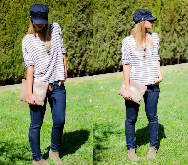 The Blue Stripes are starring in many casual looks , giving a fresh and youthful touch. There is no doubt that it is a safe look, but not everything is valid. The stripes not need much else around, so the jeans are enough to a look with sailor shirt. The trendy touch, a fishing cap and transparent rimmed glasses.